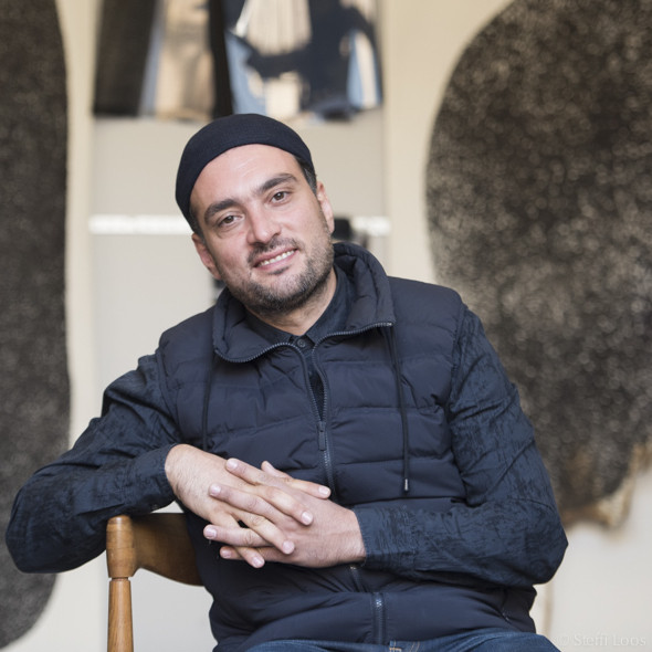 Ali Kaaf wurde in Oran, Algerien geboren. Seine Eltern sind beide aus Syrien, dort ist er auch aufgewachsen. Studiert hat Ali im Libanon und in Berlin. Er malt. Aber nie bunte Bilder. Alis Bilder sind schwarz. Manchmal arbeitet er mit Feuer und mit den Spuren, die das Feuer hinterläßt. Oder er macht Skulpturen aus Glas, die an Helme erinnern. Oder an Tierwesen aus dem Meer.