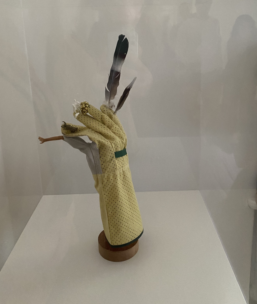 Dafür an einem richtigen Handschuh (oder einer Zeichnung einer Hand auf Papier) Federn, Stöckchen und kleinen Figuren anbringen.