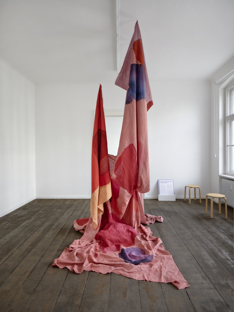 In der Mitte des Raumes von Nadine Schemmann hängt ein großes Gemälde. Es ist schwer zu sagen, wie groß es ist, weil die Leinwand an zwei Punkten an der Decke drapiert und gefaltet hängt – und nicht, wie wir es gewohnt sind, in einem Rahmen an der Wand befestigt ist. Die Farben fließen durch das Gemälde, von Rosa über Rot bis hin zu Tiefblau. Überhaupt scheint alles an diesem Kunstwerk zu fließen, von den ineinander übergehenden Farbschichten bis hin zum Stoff selbst.