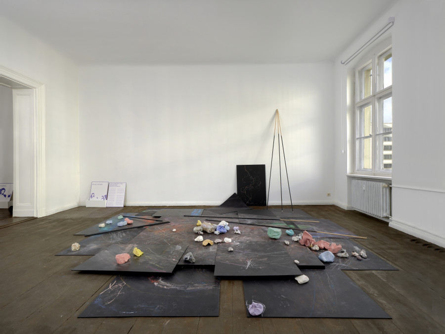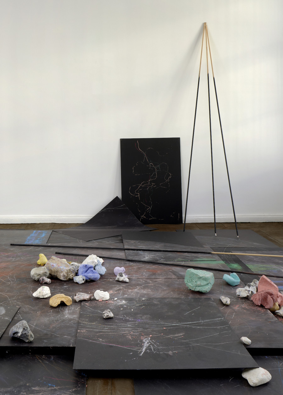Auf einem Bildschirm im Raum wird ein Film von Nicole und Jan Burkhardt gezeigt und dadurch wird die Entstehung des Kunstwerkes klar: In weiß gekleidet tanzen Nicole und Jan über die Tafeln. Sie benutzen dabei die langen Stöcke als Verlängerung ihrer Arme, malen und verwischen Spuren, während sie sich bewegen. Die Kreide-Spuren stammen von den Bewegungen ihrer beiden Körper.