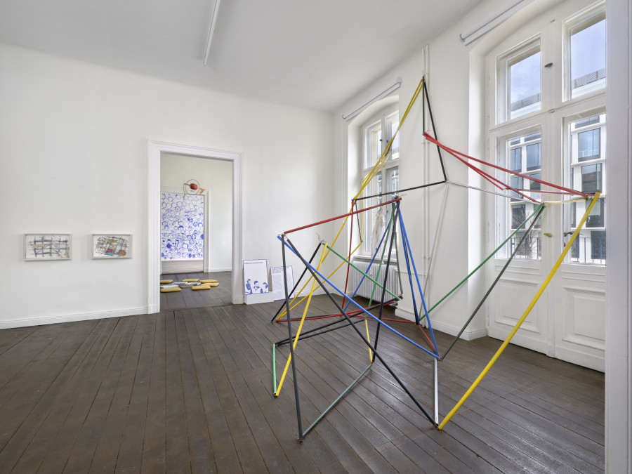 Yorgos’ Vater war Elektriker und er hat ihm schon früh geholfen. Der Wunsch seines Vaters war es, dass Yorgos selbst auch Elektriker wird. Der ist zwar nicht in Erfüllung gegangen, aber zumindest die Materialien, mit denen Yorgos heute arbeitet, haben Verbindung zu dem Beruf seines Vaters. Die große Installation besteht nämlich aus Kabeln und Kabelrohren, die der Künstler bunt beklebt hat und die den Raum strukturieren.